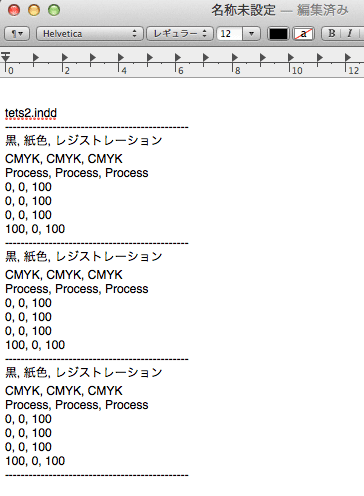 on open dorp set fileColorList to {} repeat with dorpFile in dorp set theFilePath to dorpFile as string set inddName to name of (info for dorpFile) set POSIXpath to quoted form of POSIX path of dorpFile set Separation to "----------------------------------------------" try set XMPtext to do shell script "sed -n '/xmpTPg:Colorants/=' " & POSIXpath if XMPtext = "" then try set XMPtext to do shell script "sed -n '/xapTPg:Colorants/=' " & POSIXpath end try end if if XMPtext = "" then set myText to "No info" set ColorCheck to "▷▷▷ カラーが混じっている可能性があります。" set infoText to return & inddName & return & Separation & return & (myText as text) & return & ColorCheck & return else set XMPtextCount2 to count paragraphs of XMPtext set XMPtextCount1 to XMPtextCount2 - 1 set paragraph1 to XMPtextCount1 set paragraph2 to XMPtextCount2 set T1 to paragraph paragraph1 of XMPtext set T2 to paragraph paragraph2 of XMPtext try set swatchNameTEXT0 to do shell script "echo | sed -n -e '" & T1 & ", " & T2 & "s/^.*<xmpG:swatchName>\\(.*\\)<\\/xmpG:swatchName>/\\1/p' " & POSIXpath set modeTEXT0 to do shell script "echo | sed -n -e '" & T1 & ", " & T2 & "s/^.*<xmpG:mode>\\(.*\\)<\\/xmpG:mode>/\\1/p' " & POSIXpath set typeTEXT0 to do shell script "echo | sed -n -e '" & T1 & ", " & T2 & "s/^.*<xmpG:type>\\(.*\\)<\\/xmpG:type>/\\1/p' " & POSIXpath set cyanTEXT0 to do shell script "echo | sed -n -e '" & T1 & ", " & T2 & "s/^.*<xmpG:cyan>\\(.*\\)<\\/xmpG:cyan>/\\1/p' " & POSIXpath set magentaTEXT0 to do shell script "echo | sed -n -e '" & T1 & ", " & T2 & "s/^.*<xmpG:magenta>\\(.*\\)<\\/xmpG:magenta>/\\1/p' " & POSIXpath set yellowTEXT0 to do shell script "echo | sed -n -e '" & T1 & ", " & T2 & "s/^.*<xmpG:yellow>\\(.*\\)<\\/xmpG:yellow>/\\1/p' " & POSIXpath set blackTEXT0 to do shell script "echo | sed -n -e '" & T1 & ", " & T2 & "s/^.*<xmpG:black>\\(.*\\)<\\/xmpG:black>/\\1/p' " & POSIXpath if swatchNameTEXT0 = "" then try set swatchNameTEXT0 to do shell script "echo | sed -n -e '" & T1 & ", " & T2 & "s/^.*<xapG:swatchName>\\(.*\\)<\\/xapG:swatchName>/\\1/p' " & POSIXpath set modeTEXT0 to do shell script "echo | sed -n -e '" & T1 & ", " & T2 & "s/^.*<xapG:mode>\\(.*\\)<\\/xapG:mode>/\\1/p' " & POSIXpath set typeTEXT0 to do shell script "echo | sed -n -e '" & T1 & ", " & T2 & "s/^.*<xapG:type>\\(.*\\)<\\/xapG:type>/\\1/p' " & POSIXpath set cyanTEXT0 to do shell script "echo | sed -n -e '" & T1 & ", " & T2 & "s/^.*<xapG:cyan>\\(.*\\)<\\/xapG:cyan>/\\1/p' " & POSIXpath set magentaTEXT0 to do shell script "echo | sed -n -e '" & T1 & ", " & T2 & "s/^.*<xapG:magenta>\\(.*\\)<\\/xapG:magenta>/\\1/p' " & POSIXpath set yellowTEXT0 to do shell script "echo | sed -n -e '" & T1 & ", " & T2 & "s/^.*<xapG:yellow>\\(.*\\)<\\/xapG:yellow>/\\1/p' " & POSIXpath set blackTEXT0 to do shell script "echo | sed -n -e '" & T1 & ", " & T2 & "s/^.*<xapG:black>\\(.*\\)<\\/xapG:black>/\\1/p' " & POSIXpath end try end if set swatchNameTEXT to repChar(swatchNameTEXT0, return, ", ") of me set modeTEXT to repChar(modeTEXT0, return, ", ") of me set typeTEXT to repChar(typeTEXT0, return, ", ") of me set cyanTEXT to repChar(cyanTEXT0, return, ", ") of me set magentaTEXT to repChar(magentaTEXT0, return, ", ") of me set yellowTEXT to repChar(yellowTEXT0, return, ", ") of me set blackTEXT to repChar(blackTEXT0, return, ", ") of me set cyanCount to 0 repeat with cyanNo from 1 to (count (paragraphs of cyanTEXT0)) set cyanAns to paragraph cyanNo of cyanTEXT0 if cyanAns = "100" then set cyanCount to cyanCount + 1 else if cyanAns = "0" then else set cyanCount to cyanCount + 1 end if end repeat set magentaCount to 0 repeat with magentaNo from 1 to (count (paragraphs of magentaTEXT0)) set magentaAns to paragraph magentaNo of magentaTEXT0 if magentaAns = "100" then set magentaCount to magentaCount + 1 else if magentaAns = "0" then else set magentaCount to magentaCount + 1 end if end repeat set yellowCount to 0 repeat with yellowNo from 1 to (count (paragraphs of yellowTEXT0)) set yellowAns to paragraph yellowNo of yellowTEXT0 if yellowAns = "100" then set yellowCount to yellowCount + 1 else if yellowAns = "0" then else set yellowCount to yellowCount + 1 end if end repeat set myText to Separation & return & swatchNameTEXT & return & modeTEXT & return & typeTEXT & return & cyanTEXT & return & magentaTEXT & return & yellowTEXT & return & blackTEXT & return on error set myText to "シェルスクリプトで問題が発生。" & return & return end try set swatchNameCheck to repChar(swatchNameTEXT0, return, "") of me set swatchNameCheck to repChar(swatchNameCheck, "黒", "") of me set swatchNameCheck to repChar(swatchNameCheck, "紙色", "") of me set swatchNameCheck to repChar(swatchNameCheck, "レジストレーション", "") of me set swatchNameCheck to repChar(swatchNameCheck, "白", "") of me set swatchNameCheck to repChar(swatchNameCheck, "C=0 M=0 Y=0 ", "") of me set modeCheck to repChar(modeTEXT0, return, "") of me set modeCheck to repChar(modeCheck, "CMYK", "") of me set typeCheck to repChar(typeTEXT0, return, "") of me set typeCheck to repChar(typeCheck, "Process", "") of me if ((swatchNameCheck = "") or (swatchNameCheck begins with "K=")) and (modeCheck = "") and (typeCheck = "") and (cyanCount ≤ 1) and (magentaCount ≤ 1) and (yellowCount ≤ 1) then set ColorCheck to "▷▷▷ おそらくグレースケールです。" else set ColorCheck to "▷▷▷ カラーが混じっている可能性があります。" end if set infoText to return & inddName & return & (myText as text) & Separation & return & ColorCheck & return end if end try set the end of fileColorList to return & infoText & return end repeat if fileColorList ≠ "" then tell application "TextEdit" activate set text of (make new document) to (fileColorList as text) end tell else activate display dialog "No info" end if end open --文字置換ルーチン on repChar(origText, targStr, repStr) set {txdl, AppleScript's text item delimiters} to {AppleSc